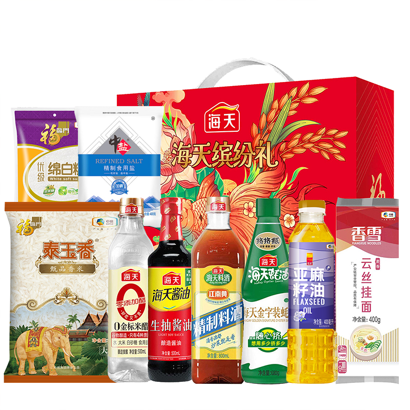 海天生抽酱油500ml 海天金标米醋500ml 海天精制料酒800ml 海天金字装蚝油680g 中粮福临门泰玉香甄品香米1kg 中粮香雪麦香云丝挂面400g 中粮悦润亚麻籽油400ml 中粮福临门优级绵白糖405g 中盐精制食用盐400g