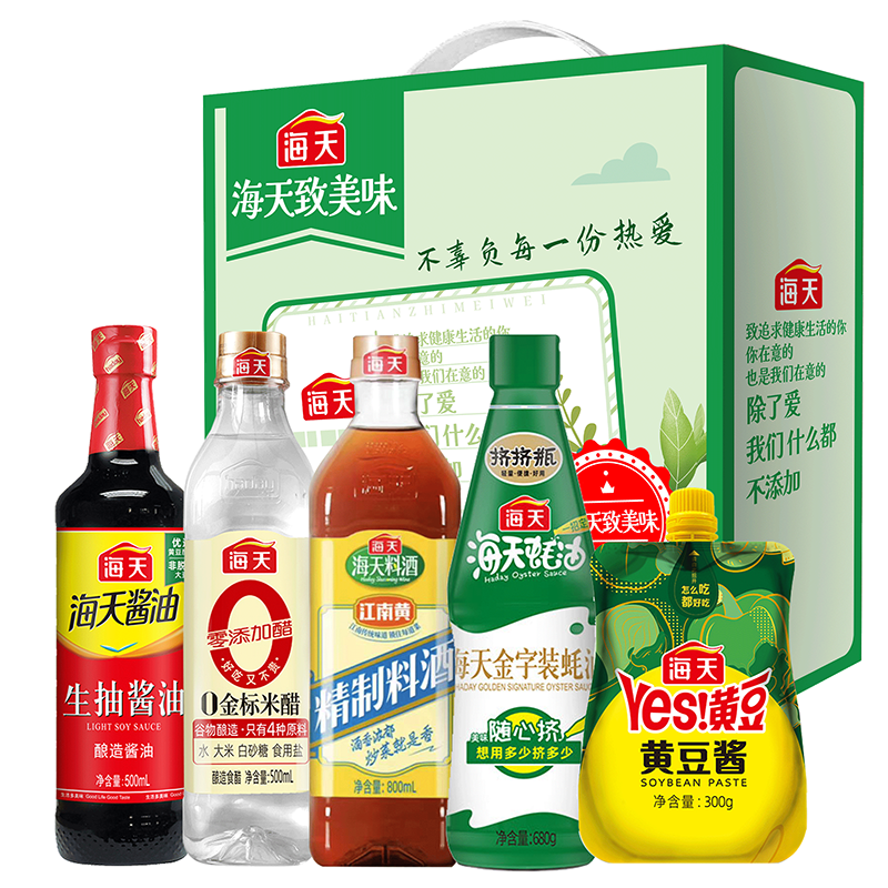 海天生抽酱油500ml 海天金标米醋500ml 海天精制料酒800ml 海天金字装蚝油680g 海天黄豆酱300g
