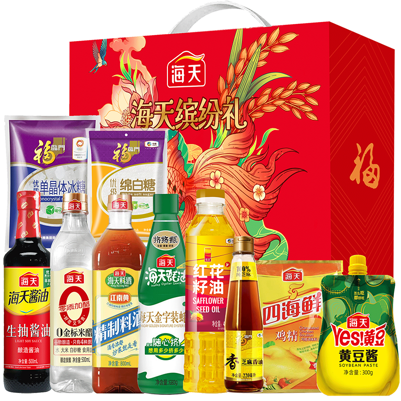 海天生抽酱油500ml 海天金标米醋500ml 海天精制料酒800ml 海天金字装蚝油680g 海天黄豆酱300g 海天四海鲜鸡精100g 中粮福临门100%纯芝麻香油220ml 中粮福临门优级绵白糖405g 中粮福临门单晶冰糖350g 中粮悦润红花籽油400ml