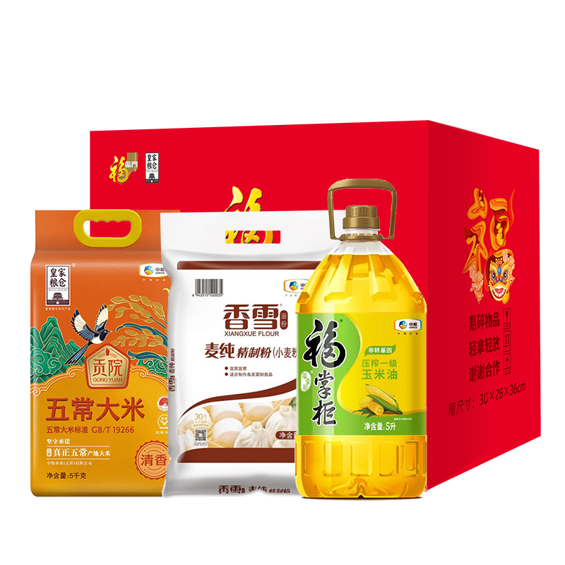 中粮皇家粮仓贡院五常大米5kg 中粮香雪麦纯精制粉5kg 中粮福掌柜压榨一级玉米油5L