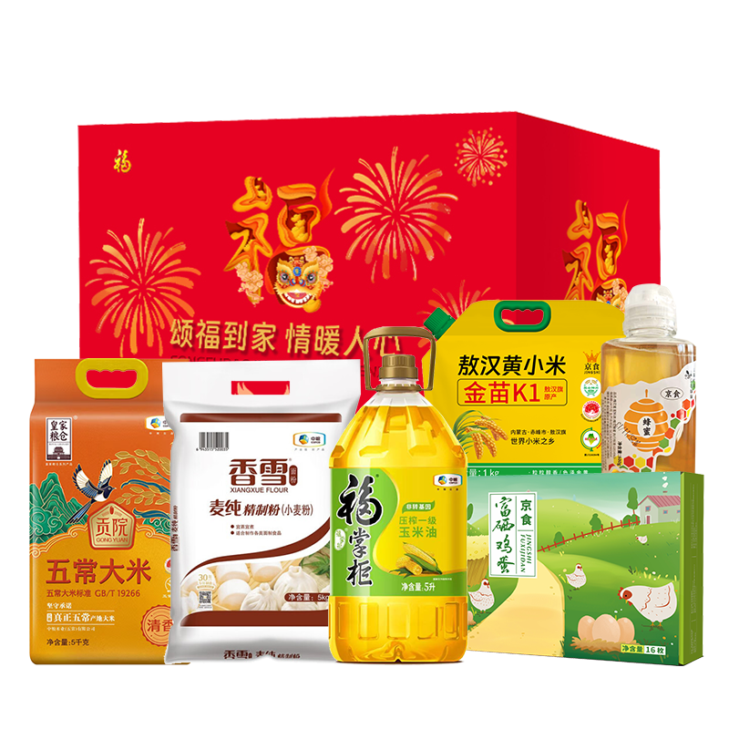 中粮皇家粮仓贡院五常大米5kg 中粮香雪麦纯精制粉5kg 中粮福掌柜压榨一级玉米油5L 京食金苗K1黄小米1kg 京食富硒鸡蛋礼盒(16枚) 京食蜂蜜500g
