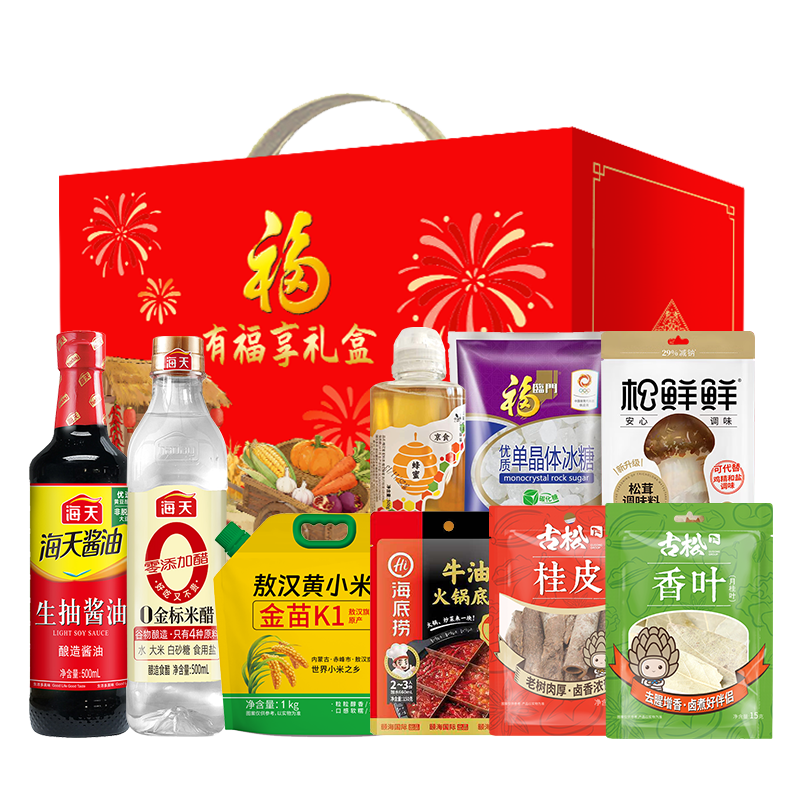 松鲜鲜松茸调味料袋装90g 海底捞麻辣底料150g 京食蜂蜜500g 海天生抽酱油500ml 古松香叶15g 古松桂皮50g 京食金苗K1黄小米1000g 海天金标米醋500ml 中粮福临门单晶冰糖350g