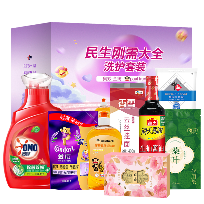 奥妙专业清洁除菌除螨洗衣液1KG 金纺衣物护理剂恬静薰衣草400g 奥妙洗洁精480g 京食小巢蜜40g*2粒 海天生抽酱油500ml 中盐精制食用盐400g 中粮香雪麦香云丝挂面400g 中粮中茶菁养桑叶代用茶85g 彩盒