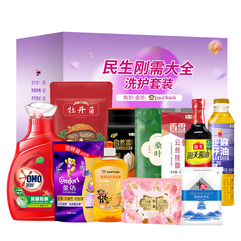 奥妙专业清洁除菌除螨洗衣液1KG 金纺衣物护理剂恬静薰衣草400g 奥妙洗洁精480g 京食小巢蜜40g*2粒 中粮悦润亚麻籽油400ml 海天生抽酱油500ml 中盐精制食用盐400g 中粮香雪麦香云丝挂面400g 中粮福临门自然香黑龙江长粒香米500g 中粮中茶菁养桑叶代用茶85g 京食精选牡丹菌100g 彩盒