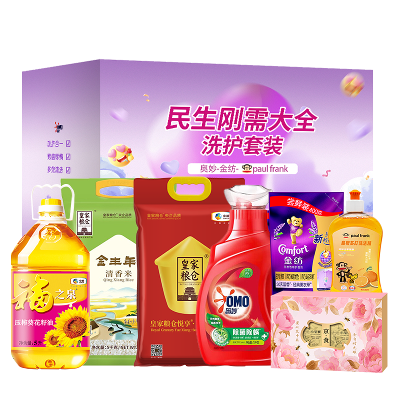 奥妙专业清洁除菌除螨洗衣液1KG 金纺衣物护理剂恬静薰衣草400g 奥妙洗洁精480g 京食·小巢蜜40g*2粒 中粮皇家粮仓金丰年清香米5kg 中粮皇家粮仓金悦享苏软香米5kg 中粮福之泉压榨葵花籽油5L 彩盒