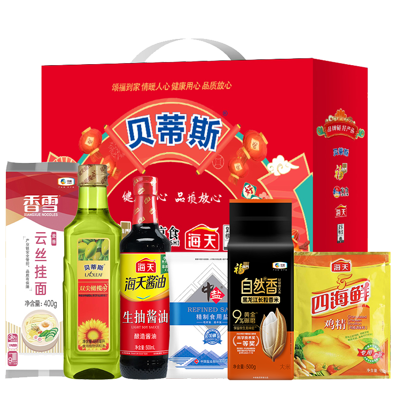 贝蒂斯橄榄油葵花籽油468ml 中粮甄选优质大米500g 中粮香雪麦香云丝挂面400g 中盐精制食用盐400g 海天生抽酱油500ml 海天四海鲜鸡精100g