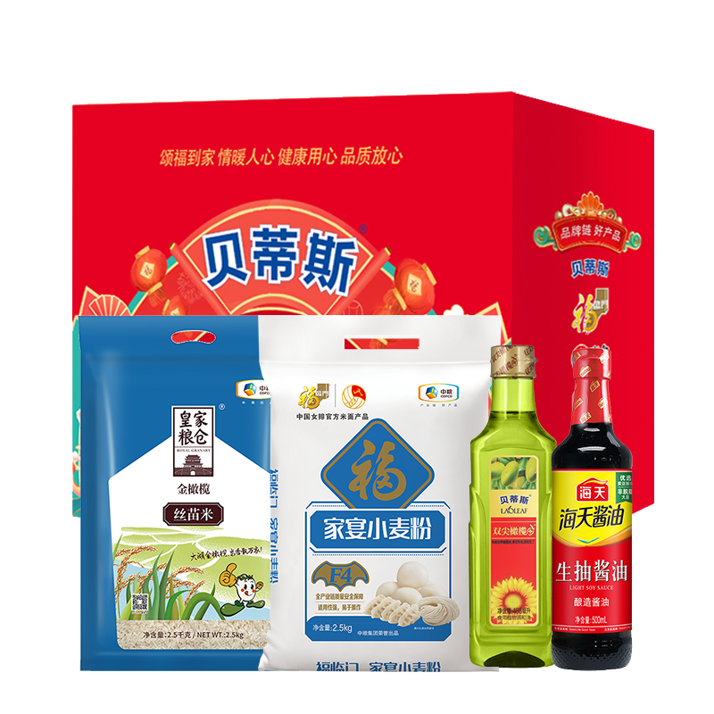 贝蒂斯橄榄油葵花籽油468ml 中粮皇家粮仓金橄榄丝苗米2.5kg 中粮福临门家宴小麦粉2.5kg 海天生抽酱油500ml