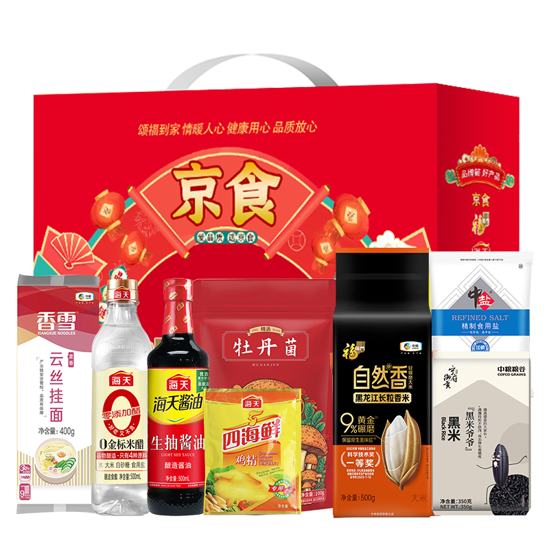 中粮甄选优质大米500g 中粮香雪麦香云丝挂面400g 中盐精制食用盐400g 海天生抽酱油500ml 海天四海鲜鸡精100g 中粮纯甄黑米爷爷350g 京食精选牡丹菌100g 海天金标米醋500ml