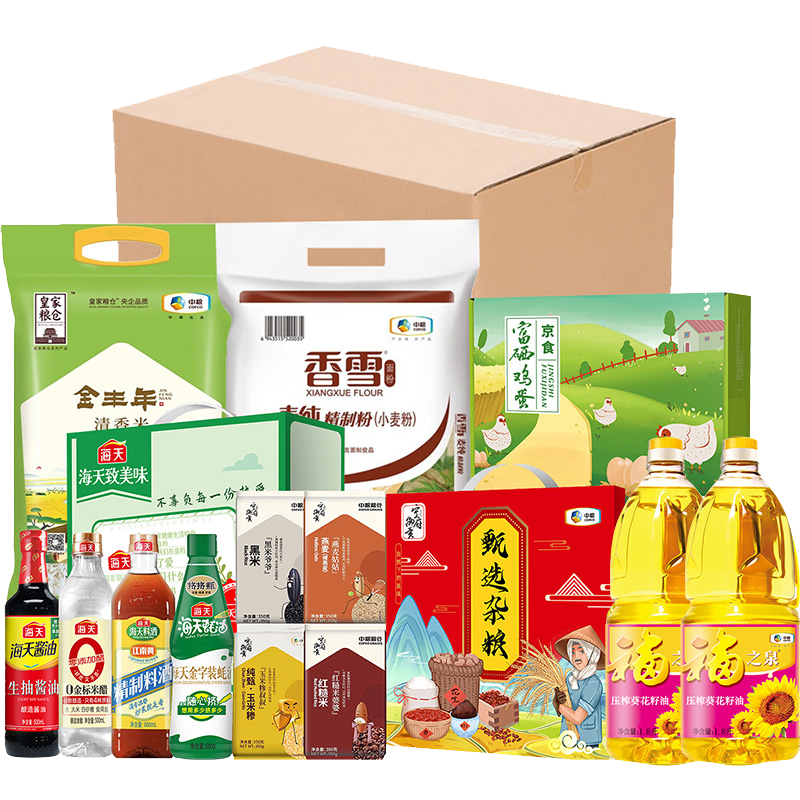 中粮皇家粮仓金丰年清香米5kg 中粮香雪麦纯精制粉5kg 中粮福之泉葵花籽油1.8L*2 京食富硒鸡蛋16枚 中粮纯甄玉米糁叔叔350g 中粮纯甄红糙米婆婆350g 中粮纯甄黑米爷爷350g 中粮纯甄燕麦姑姑350g 海天生抽酱油500ml 海天金标米醋500ml 海天精制料酒800ml 海天金字装耗油680g (注:鸡蛋单独发货)
