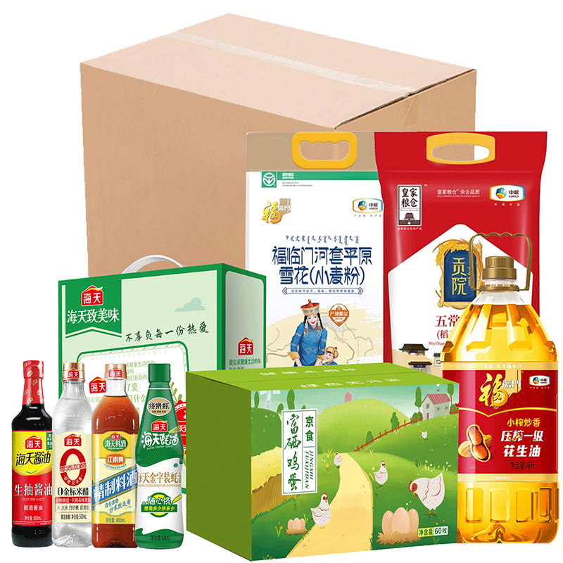 中粮皇家粮仓五常稻花香5kg(稻花香2号) 中粮福临门小榨炒香花生油4L 海天生抽酱油500ml 海天金标米醋500ml 海天精制料酒800ml 海天金字装耗油680g 中粮福临门河套平原尚品雪花粉(小麦粉)5kg 京食富硒鸡蛋60枚 (注:鸡蛋单独发货)