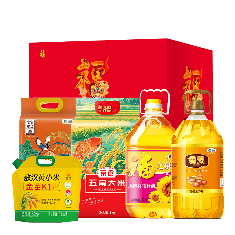 京食金苗K1黄小米2.5kg 中粮皇家粮仓贡院五常大米5kg 京食五常大米(稻花香2号)5kg 中粮福之泉葵花籽油5L 中粮·鲁蒙压榨一级花生油5L