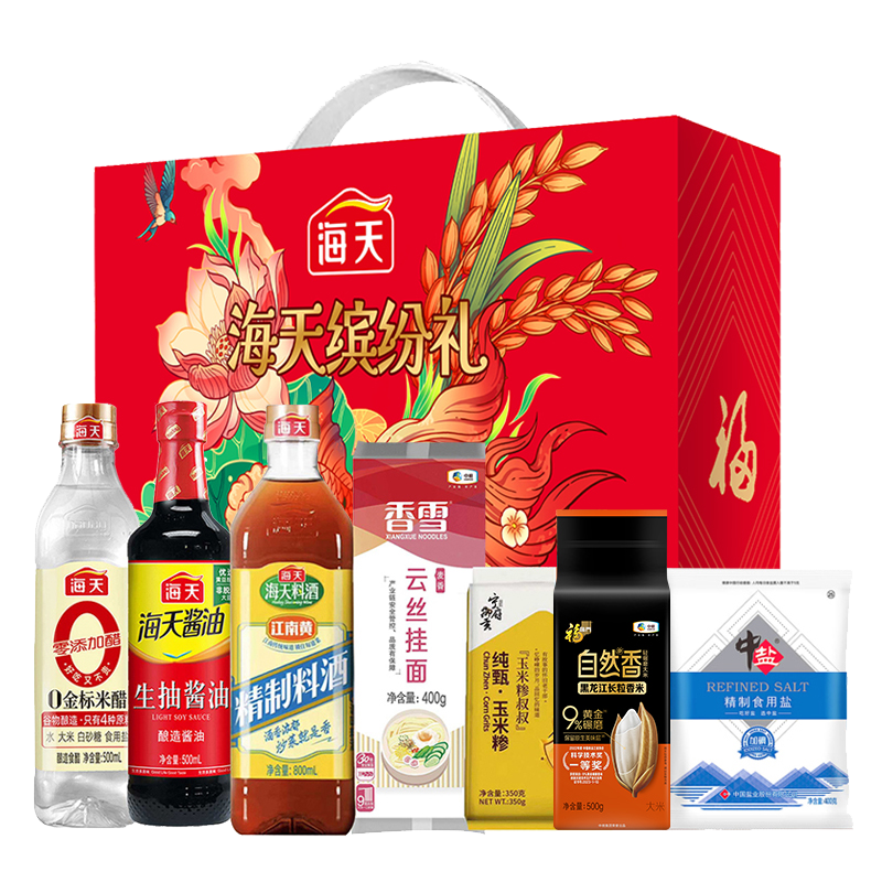 海天生抽酱油500ml 海天金标米醋500ml 海天精制料酒800ml 中粮甄选优质大米500g 中粮香雪麦香云丝挂面400g 中粮纯甄玉米糁叔叔350g 中盐精制食用盐400g