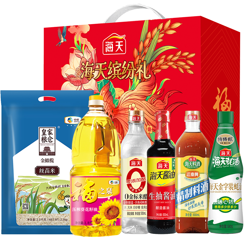海天生抽酱油500ml 海天金标米醋500ml 海天精制料酒800ml 海天金字装蚝油680g 中粮皇家粮仓金橄榄丝苗米2.5kg 中粮福之泉压榨葵花籽油1.8L