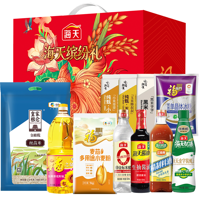 海天生抽酱油500ml 海天金标米醋500ml 海天精制料酒800ml 海天金字装蚝油680g 中粮皇家粮仓金橄榄丝苗米2.5kg 中粮福之泉压榨葵花籽油1.8L 中粮纯甄玉米糁叔叔350g 中粮纯甄黑米爷爷350g 中粮纯甄黄小米哥哥350g 中粮福临门多用途麦芯粉1kg 中粮福临门单晶体冰糖350g
