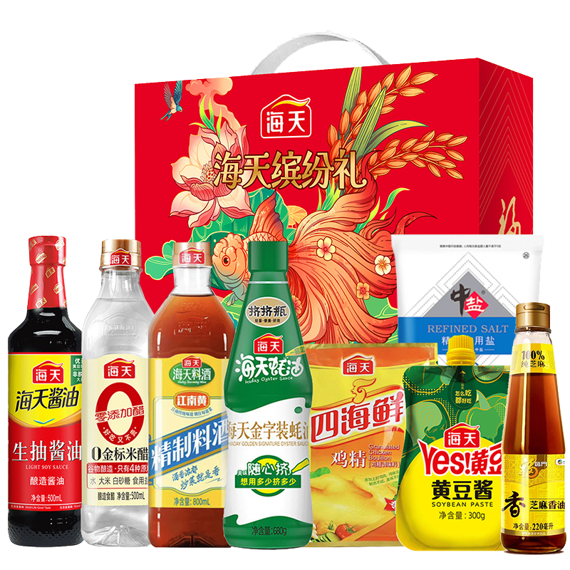 海天生抽酱油500ml 海天金标米醋500ml 海天精制料酒800ml 海天金字装蚝油680g 海天黄豆酱300g 海天四海鲜鸡精100g 中粮福临门100%纯芝麻香油220ml 中盐精制食用盐400g