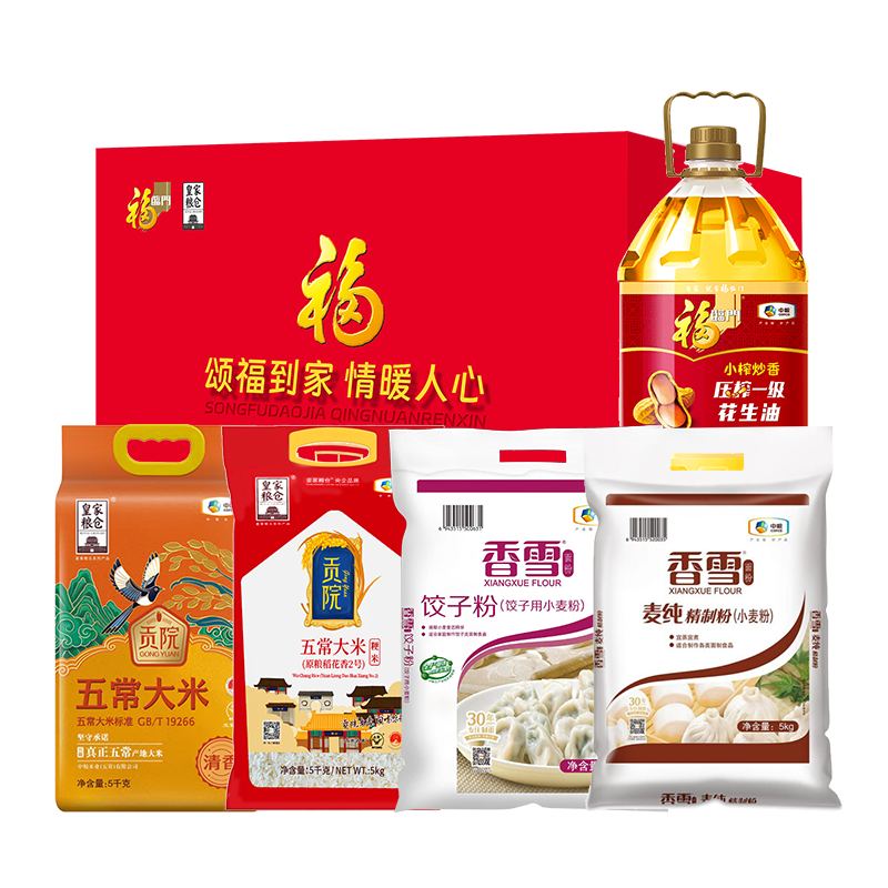 中粮皇家粮仓贡院五常大米5kg 中粮皇家粮仓贡院五常大米5kg(稻花香2号) 中粮香雪饺子粉5kg 中粮香雪麦纯精制粉5kg 中粮·福临门小榨炒香压榨一级花生油5L