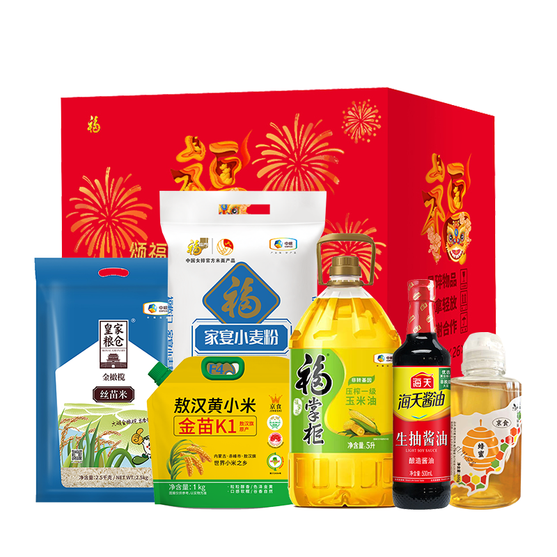 中粮皇家粮仓金橄榄丝苗米2.5kg 中粮福临门家宴小麦粉2.5kg 中粮福掌柜压榨一级玉米油5L 京食金苗K1黄小米1kg 海天生抽酱油500ml 京食蜂蜜500g