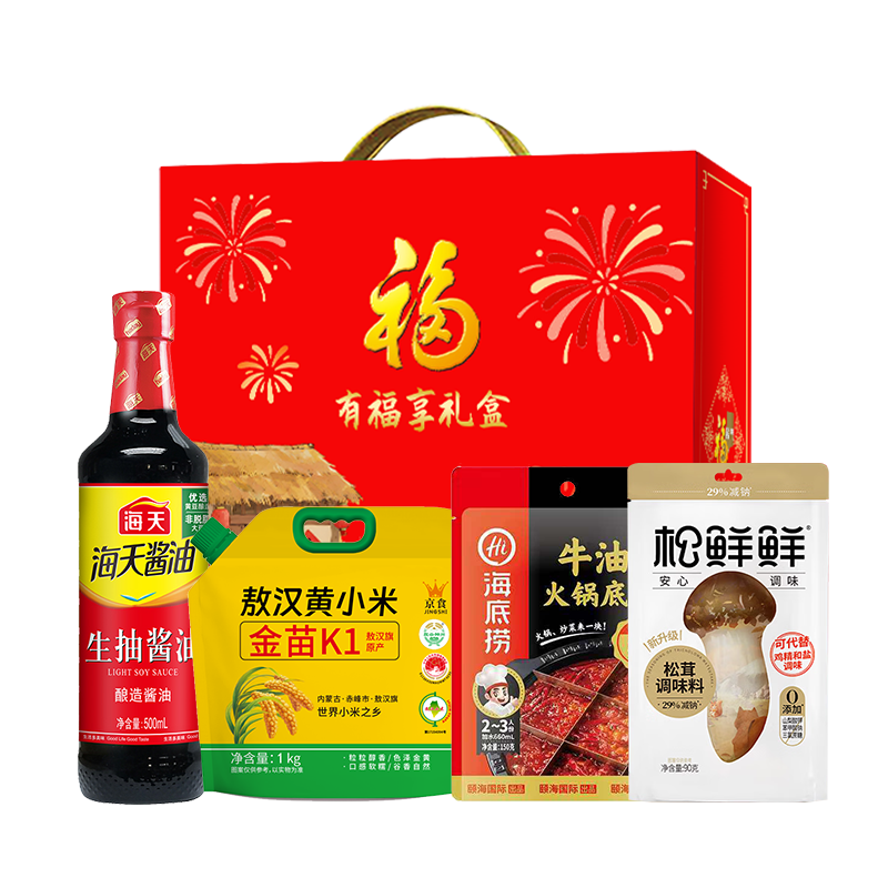 松鲜鲜松茸调味料袋装90g 海底捞麻辣底料150g 海天生抽酱油500ml 京食金苗K1黄小米1000g
