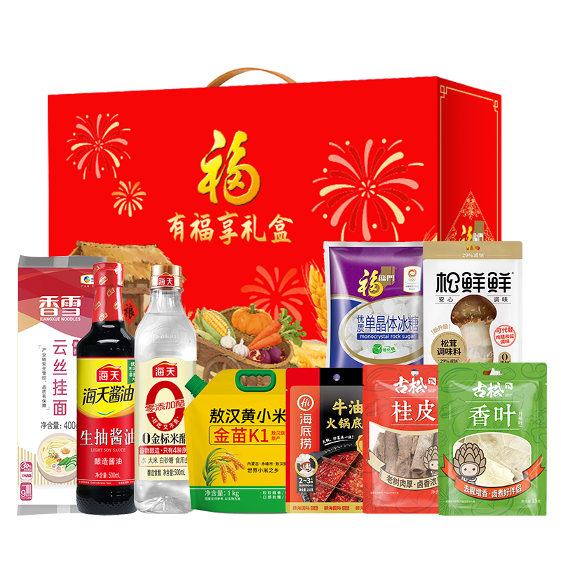 松鲜鲜松茸调味料袋装90g 海底捞麻辣底料150g 海天生抽酱油500ml 古松香叶15g 古松桂皮50g 京食金苗K1黄小米1000g 海天金标米醋500ml 中粮福临门单晶冰糖350g 中粮香雪麦香云丝挂面400g