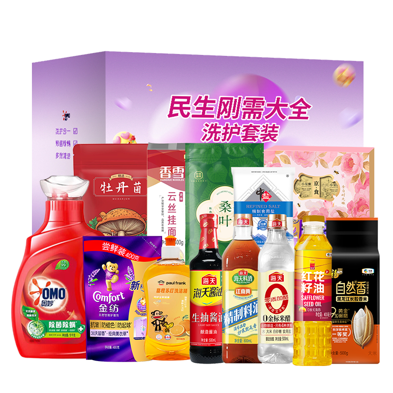 奥妙专业清洁除菌除螨洗衣液1KG 金纺衣物护理剂恬静薰衣草400g 奥妙洗洁精480g 中粮悦润红花籽油400ml 海天生抽酱油500ml 京食小巢蜜40g*2粒 海天金标米醋500ml 中盐精制食用盐400g 中粮香雪麦香云丝挂面400g 中粮福临门自然香黑龙江长粒香米500g 中粮中茶菁养桑叶代用茶85g 京食精选牡丹菌100g 海天精制料酒800ml 彩盒