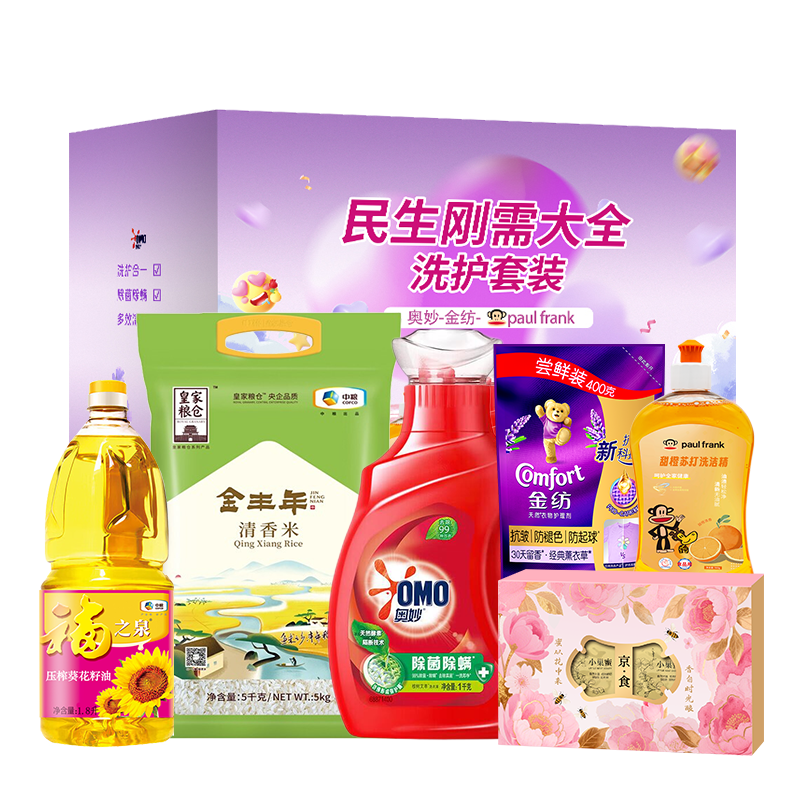 奥妙专业清洁除菌除螨洗衣液1KG 金纺衣物护理剂恬静薰衣草400g 奥妙洗洁精480g 京食·小巢蜜40g*2粒 中粮皇家粮仓金丰年清香米5kg 中粮福之泉压榨葵花籽油1.8L 彩盒