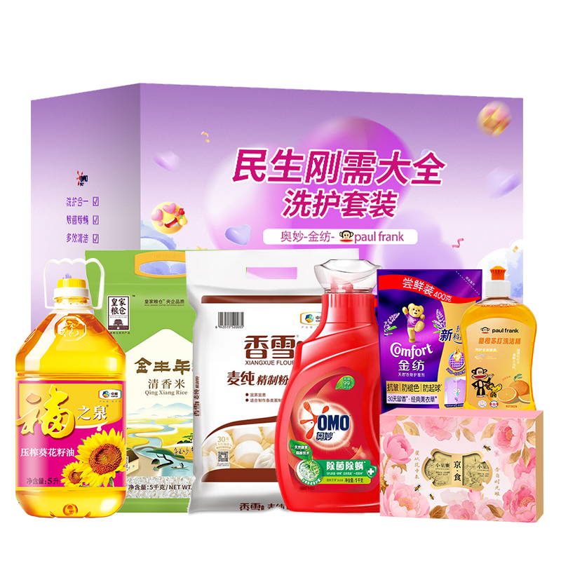奥妙专业清洁除菌除螨洗衣液1KG 金纺衣物护理剂恬静薰衣草400g 奥妙洗洁精480g 京食·小巢蜜40g*2粒 中粮皇家粮仓金丰年清香米5kg 中粮·香雪麦纯精制粉5kg 中粮福之泉压榨葵花籽油5L 彩盒