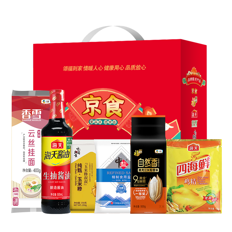 中粮甄选优质大米500g 中粮香雪麦香云丝挂面400g 中盐精制食用盐400g 海天生抽酱油500ml 海天四海鲜鸡精100g 中粮纯甄玉米糁叔叔350g