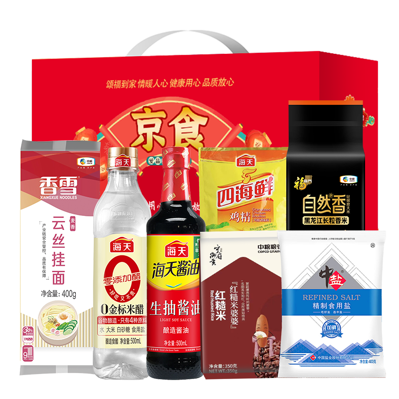 中粮甄选优质大米500g 中粮香雪麦香云丝挂面400g 中盐精制食用盐400g 海天生抽酱油500ml 海天四海鲜鸡精100g 中粮纯甄红糙米婆婆350g 海天金标米醋500ml